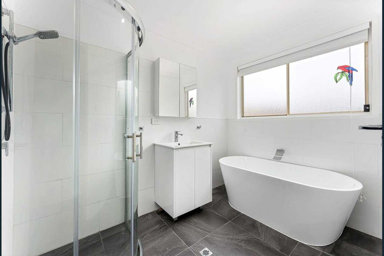 The main bathroom has been recently renovated and finished in classic white and charcoal coloured floor tiles